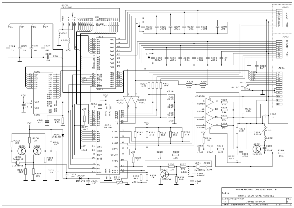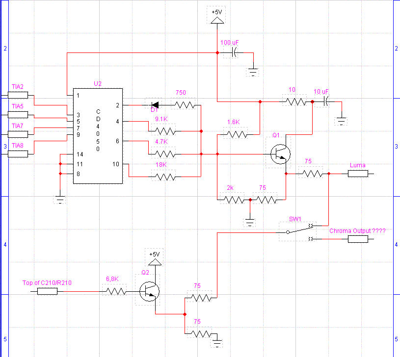 Pour améliorer la sortie composite de base de la console, voici un schéma permettant d’ajouter une extension (pcb) en se connectant directement sur les sorties du TIA de l’atari.