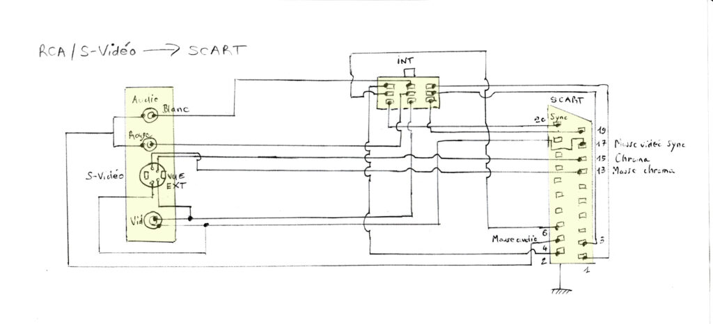 Pour votre câble, vous devrez diriger vos fils sur la position gauche de l’interrupteur, donc le fil n° 20 pour le signal Y (et 17 pour sa masse), et les fils 2 et/ou 6 pour l’audio mono (et 4 pour la masse audio). Le signal Chroma est quant à lui toujours dirigé vers le fil 15 et sa masse sur le fil 13 de la péritel.