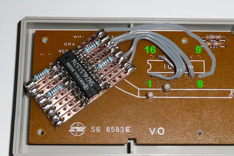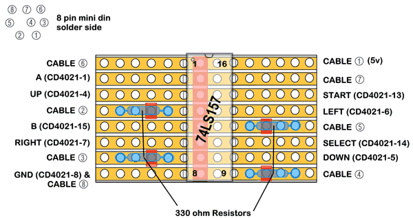 Puis il faut fabriquer un autre petit PCB contenant un chip SN74LS157 (un multiplexeur je crois) et lui adjoindre 4 résistances de 330 ohms suivant le schéma ci-contre.