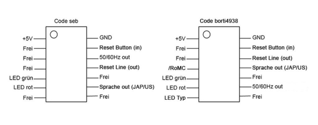 Autre remarque : Le pin 4 pour le code Borti (/RoMC) contrôle la réinitialisation de la console lors du changement de fréquence. Il doit dans ce cas être relié à la masse GND (et 5V si pas de réinitialisation).