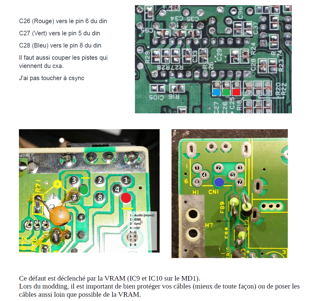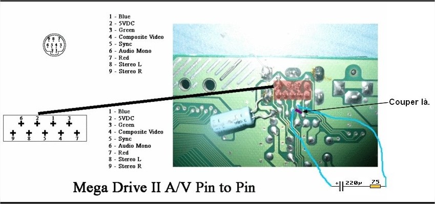 Dans le second cas, il faut changer le circuit d’amplification (cxa) par un de meilleur qualité. Ou bien dévier la trajectoire (circuit) d’origine de la vidéo et ajouter un condensateur. Voici pour la mégadrive 1 :