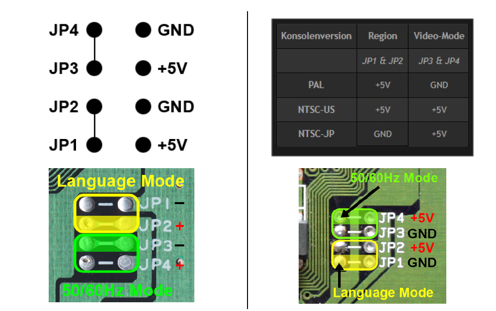 Voici le détail des 4 cavaliers JP (ou jumpers) de la console qui fonctionne comme 2 interrupteurs ouvert/fermé pour prendre 1 des 2 valeurs (0 ou 1, autrement GND ou +5V). Suivant les variantes de consoles, les cavaliers ne sont placés au même endroit mais gardent la même valeur.